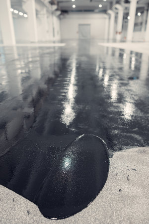 Worker, coating floor with self-leveling epoxy resin in industrial workshop.