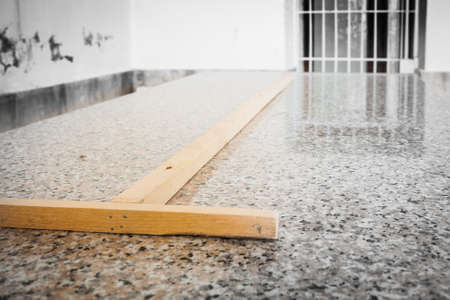Floor repair. Self-filling floors. Interior of apartment under construction. Mirror smooth surface of the floor. Floor covering with self leveling cement mortar. Roller application