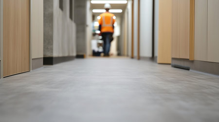 A smooth concrete floor with cool grey tones, reflecting light in empty space