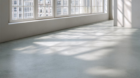 An empty room with a concrete floor and multiple windows, allowing natural light to illuminate the space. The industrial background gives a sense of rawness and simplicity to the room.