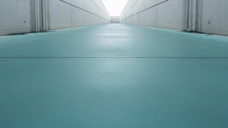 An expansive, modern concrete corridor stretches forward, its symmetrical walls creating a strong sense of perspective that leads the eye towards a bright, white light at the vanishing point. The smooth, grey concrete surfaces are clean and minimalist, with subtle textures and lines adding visual interest. The bright light at the end of the corridor suggests a destination or a sense of hope, contrasting with the stark, imposing nature of the architectural space. The blue-tinted floor adds a...