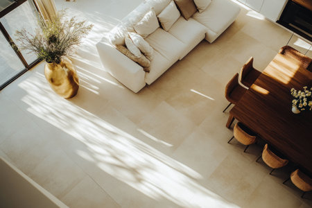 A wide shot of an elegant, modern living room with minimalist furniture, white walls, and beige floor tiles. A large, gold vase on the table holds flowers, and soft daylight streams in through the windows. The image is captured from a high angle, with professional-quality photography and high resolution. --ar 3:2 --v 6.1 Job ID: e1bd7946-10e2-498d-801a-4e27c58de2fb