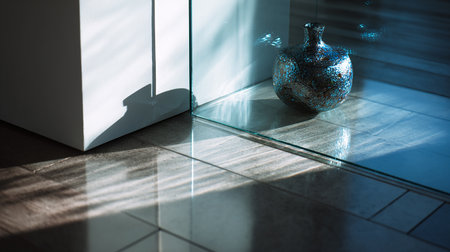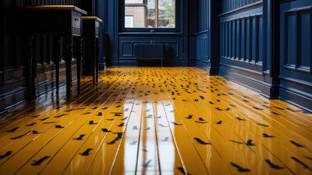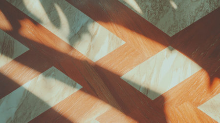 An interior shot features a patterned floor with a play of light and shadow. The design incorporates rectangular shapes and linear elements with color contrast. The lighting creates a contrast between light and dark areas. This image can be used for commercial projects such as backgrounds, or conceptual illustration.