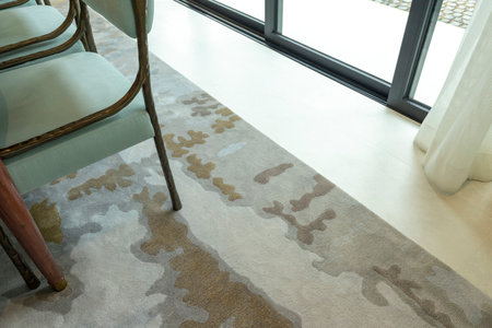Luxurious modern furniture of home interior. Close up at carpet rug on the floor.