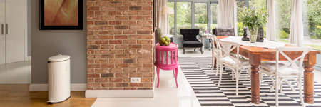 Stylish scandinavian dining area with wooden table, chairs, patterned flooring in orangery
