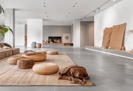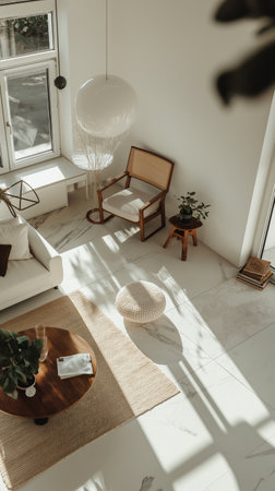 Minimalist interior design composition in a bright room with Scandinavian and zen decor. Home interiors in a luxurious style.