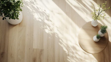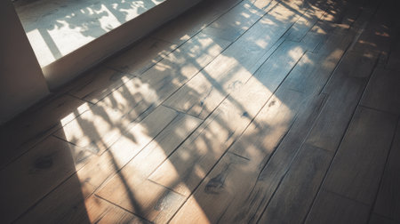 A serene indoor scene showcasing natural light creating intricate shadows on a wooden floor, influenced by green plants, evoking warmth and calmness.
