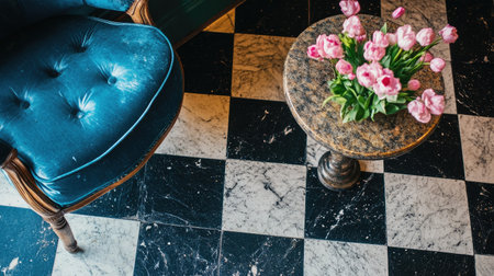 Top view of a black and white checkered tile floor, showcasing bold contrasts and geometric design.