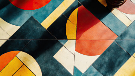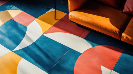 Bold, modern floor tile pattern with striking geometric shapes and bright colors