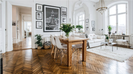 Bright and airy apartment with a sophisticated design. The open-plan living and dining area is beautifully accented with natural light and a herringbone wood floor. Various pieces of furniture and artwork enhance the overall aesthetic.