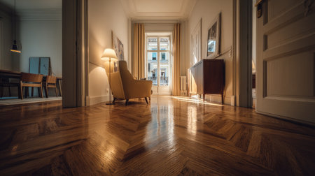 Perspective view of a highly polished herringbone parquet floor in a spacious living area of a home. Natural light streams in, reflecting beautifully off the polished wood surface. The space features a dining area, a living area with furniture, and doors leading to other parts of the home. The overall impression is of a bright, elegant, and well-maintained interior design.