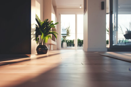 Warm sunlight fills a contemporary room with wooden flooring and potted plants, creating a serene atmosphere in the early evening.