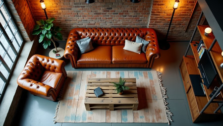Stylish industrial living room with leather sofa wooden table and vintage accents