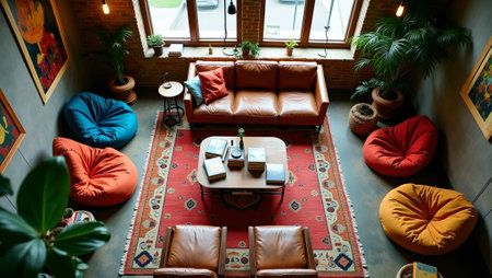 Artist loft living room with mismatched furniture vibrant rugs art books and indoor plants