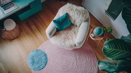 birds-eye view of a stylishly decorated balcony with a table, chair, and patterned rug, created with generative ai