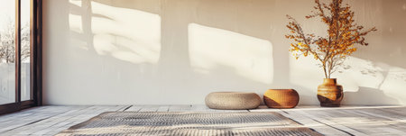 Minimalist luxury interiors composition with Japanese elements and natural window lighting. Interiors design property conceptual image for advertising.