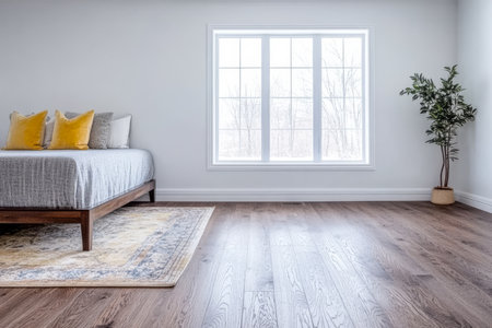 A spacious bedroom featuring a wooden bed with yellow accent pillows and a soft rug. Large windows allow natural light to flood the room enhancing the calming ambiance.