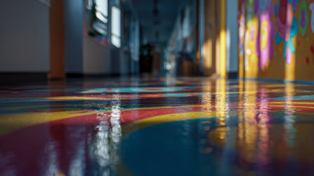 A lively indoor corridor featuring a glossy, multicolored floor bathed in sunlight, with dynamic murals that inspire creativity and joy.