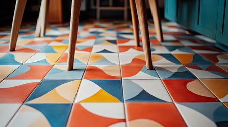 A close-up of colorful encaustic cement tiles, highlighting their geometric pattern and smooth texture in a vibrant kitchen.