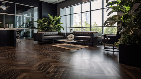 Interior of an empty room with parquet floor and black chairs