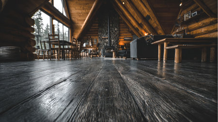 This image captures the inviting interior of a rustic cabin, featuring wooden beams, a natural wooden floor, and warm lighting, creating a serene atmosphere.