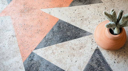 Pastel coral and gray dashed patterns adorn the floor, seamlessly blending for a serene environment. A charming potted cactus adds a touch of nature to the stylish decor.