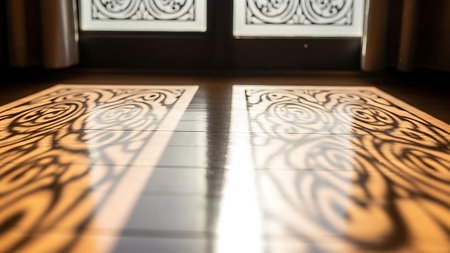 Floor showing intricate shadow patterns cast by ornate window grilles onto a polished wooden floor creating a striking abstract geometric with warm light. resolution use.