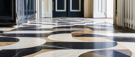 Luxurious marble floor showcases a stunning geometric design with reflections that dazzle in bright light.