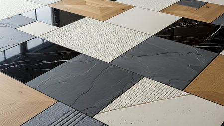 Colorful ceramic floor tiles in a modern living room, stock photo