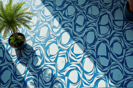 Blue and white geometric tile with potted fern and leaf shadows. That the image is generated using AI.