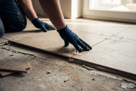 A dedicated craftsman expertly installs tile flooring during a renovation project. The image captures focused hands at work, showcasing skill and precision.