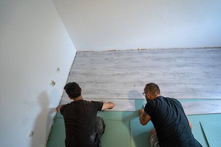 Father and son installing new wooden laminate flooring on a warm film floor. Infrared floor heating system under laminate floor