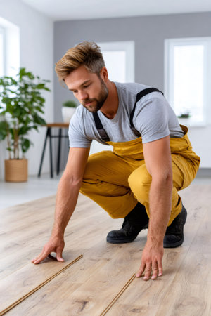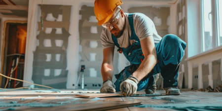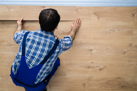 Handyman installing laminate floor planks on home renovation project