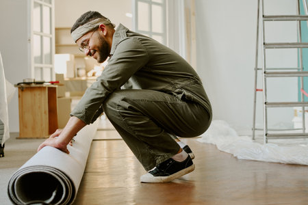 Young adult man crouching and rolling out carpet during home renovation, wearing headband and glasses, preparing floor in bright room with ladder in background