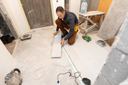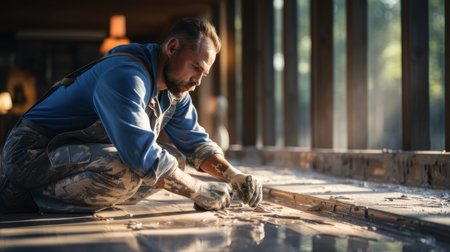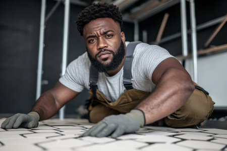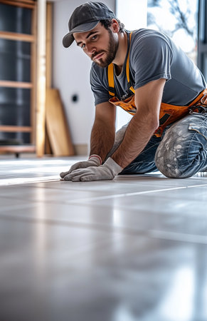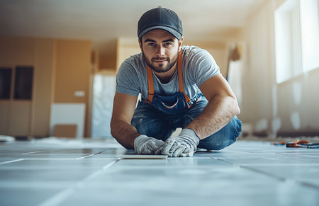 Skilled Tradesman Expertly Laying Beautiful Tile Flooring in Modern Home for Elegant Interior Appeal