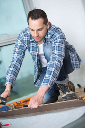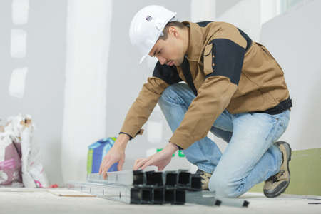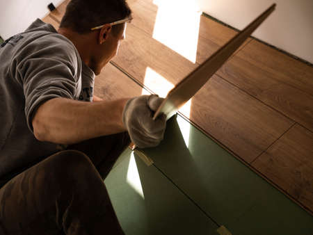 Repairman laying laminate flooring at home.