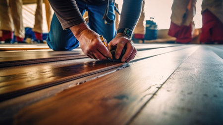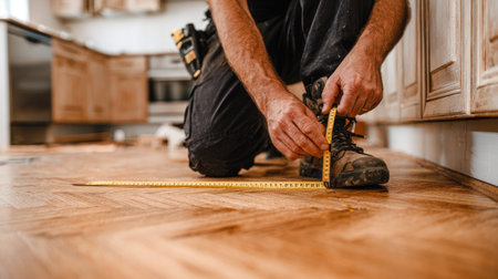 A man is measuring the width of a wooden floor. AI generative image.