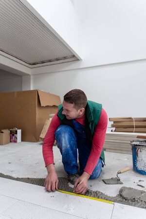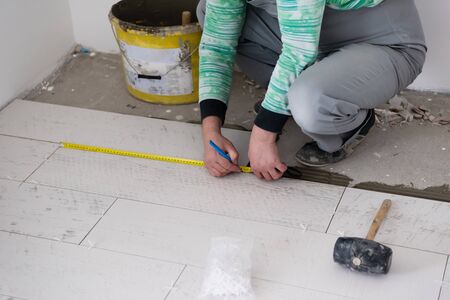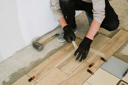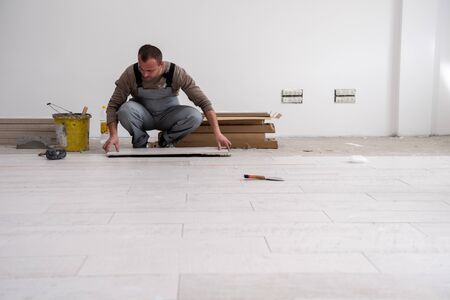 skilled worker installing the ceramic wood effect tiles on the floor Worker making laminate flooring on the construction site of the new apartment