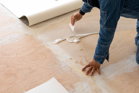 A person installing new vinyl tile floor, a DIY home project.