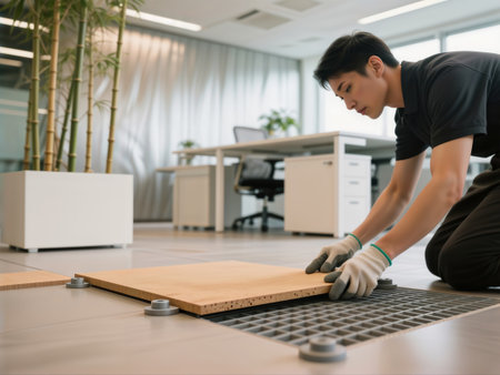 Man installing raised floor tiles in a modern office.