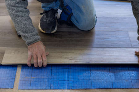 Work on laying worker installing new vinyl tile laminate wood texture floor.