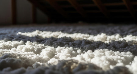 Fluffy white fiberglass insulation material covering an attic floor. strong light and shadow create visual contrast, highlighting the texture. energy efficiency, home improvement concept.