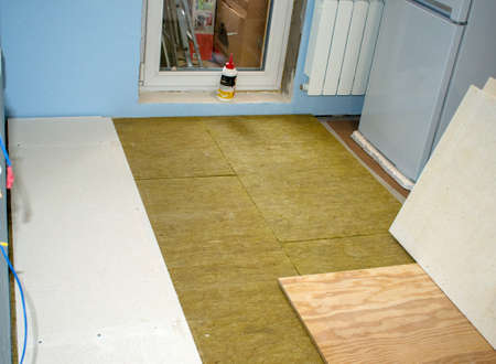 Laying the floor in the apartment. Stone wool for the floor. Sound insulation of floors for the national tie. Part of the fridge, part of the balcony door and battery.