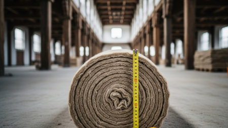 Construction worker is measuring mineral wool insulation material with tape measure during renovation or construction work