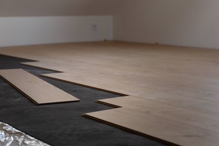 Construction worker installing laminate floor in a new renovated attic. Home improvement concept.