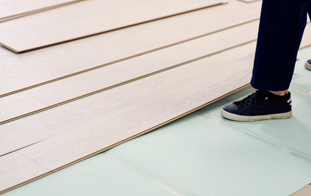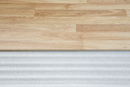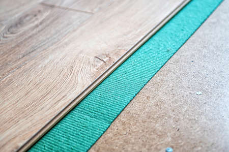 Installing wooden laminate or parquet floor in room over green noise absorbing base, closeup