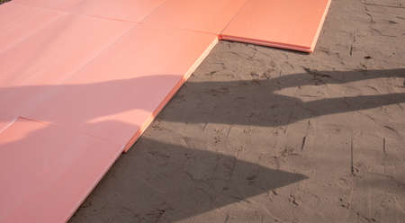 The polyplex polystyrene slab is laid on wet sand as insulation for the foundation of an outdoor swimming pool.