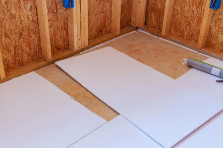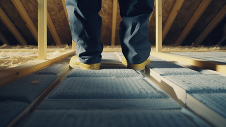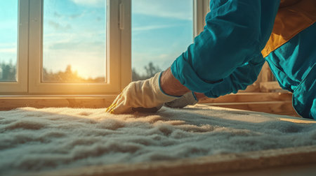 A craftsman carefully places a eco-friendly wool insulator onto a wooden subfloor amid a bright, sustainable-building environment, highlighting eco-conscious craftsm