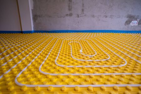 yellow underfloor heating installation with white polyethylene pipes on construction site of new two level apartment