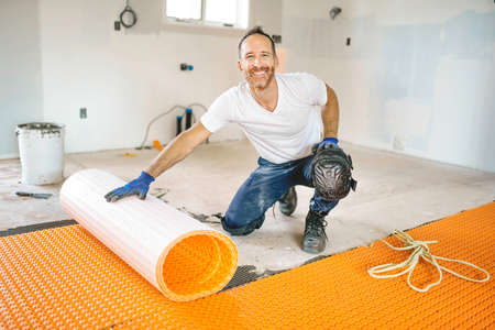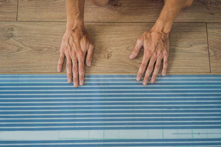 Man installing new wooden laminate flooring on a warm film floor. Infrared floor heating system under laminate floor
